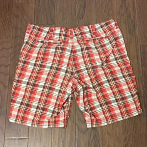 This fun Red Plaid pair of Bermuda Shorts is the perfect cool comfortable summer piece of clothing. The 100% cotton fabric ensures that you stay cool in the heat. Front and side pockets are all deep enough to stadh you phone. Although they seem to be men's sizing, I enjoyed wearing them. There are no visible signs of wear. Excellent Like New Condition.