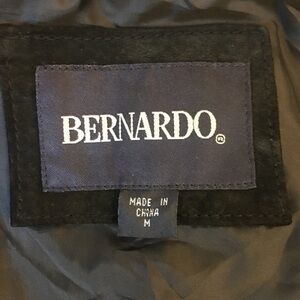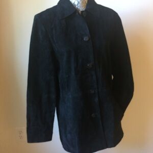 Black suede button up jacket with collar and pockets. Small shoulder pads. Buttons and button holes reinforced to handle wear.