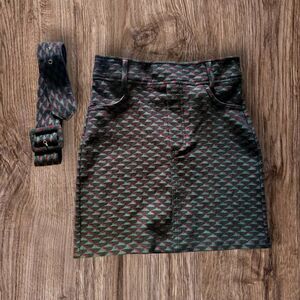 This cute chic skirt features a green, red, and black geometric pattern, 16-inch length. It includes a matching removable belt and false pockets.