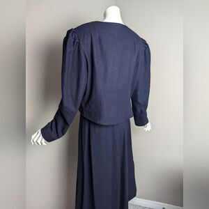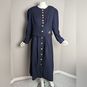 Berwin & Wolff, wool suit, vintage two-piece, navy wool set, puffed shoulder jacket, pleated skirt, heart button detail, embroidered ivy, traditional German clothing, classic women's suit, size large, vintage fashion, European design, elegant ensemble, lined wool jacket, skirt with pockets