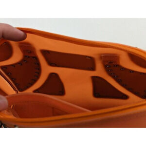Pre-owned Besso orange leather double strap handbag purse with silver studs and an identification tag attached. Style No: 2494. Bag is in excellent condition with minor wear on the edges. Measurements are 11"x5"x9". Please review photos for further details.