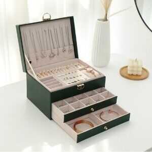 • Three Tiers with Drawers: This jewelry box features three layers with two drawers, each offering a unique storage solution for different types of jewelry. The layers consist of a combination of compartments, slots, and small drawers, each designed to hold different types of jewelry such as rings, necklaces, bracelets, and earrings. This tiered design not only allows for optimal organization, but it also makes it easy to view and access your jewelry at a glance.