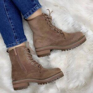 Fall and winter faux-suede combat boots. These trendy lace-up boots look great paired with skinny jeans, slim-cut jeans, or even midi skirts! Versatile pair.
