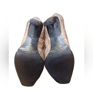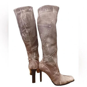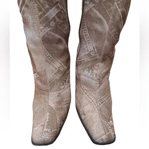 Light brown and cream in color, these square toe boots zip up to just under the knee. There is some stretch to the tops of these boots. Side zipper closure. A denim jean collage picture all over the boots! Perfect for chilly autumn days.