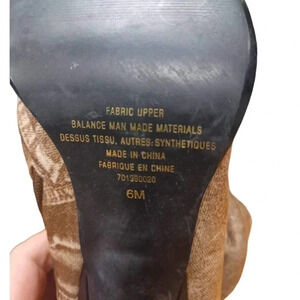 Light brown and cream in color, these square toe boots zip up to just under the knee. There is some stretch to the tops of these boots. Side zipper closure. A denim jean collage picture all over the boots! Perfect for chilly autumn days.
