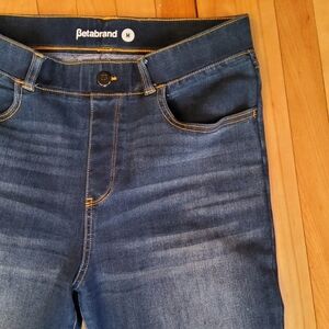 Betabrand yoga denim jeans straight -leg 4 pockets super high rise Super stretchy and flattering Size Medium Dark denim blue wash straight-leg 4 pockets Waist 16" Inseam 33" Front rise 12" Excellent condition; Like new; no flaws; Bought new. one for sale, listed under all sizes Questions? Leave a comment below!