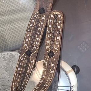 GORGEOUS DESIGNER BELT NWOT DECORATED WITH BEADS AND RIVETS FOR A NICE LOOK Length about 33 ( middle hole) wide just under 2 inches so nice! Medium size.