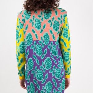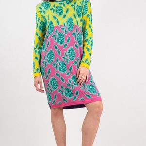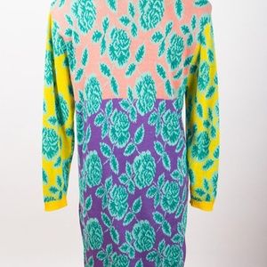 Totally awesome vintage 1980s 'punk label' Betsey Johnson (before her super popular Betsey Johnson brand that we know from the 90's/00's) sweater dress. Bright bold knit quadrants in yellow, pink, purple, and peach with intarsia knit roses Betsey is famous for. Comfy cotton knit, rib crew neck, long sleeves and attached shoulder pads, long tunic style fit. Although not the only one made, I will make you a bet that it might be the only one still around :: Fits a modern size small-medium-large :: Chest: 44 Sleeve: 24 Shoulder 21 Waist: 40 Hips: 42 Length: 39 Model is 5'9" (6' in heels) and a size 0-2 | DETAILS | Silhouette: Long sleeve tunic sweater dress Label: Betsey Johnson Material: Cotton Colors: Pink, yellow, green, purple, peach Condition: Excellent!