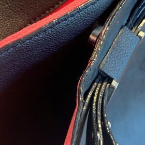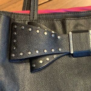 Stylish black tote with a vibrant pink interior. Features a decorative bow and stud accents. Perfect for everyday use.