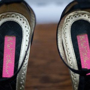 90s vintage Betsey Johnson Heel. Black and Gold Strappy 3" heel, size 8M. Silver crystal ball, all crystals still intact. Buckle up. Original Betsey Johnson logo on front and back. Black and gold sole, black bottom and pink ball of shoe. Worn. :)