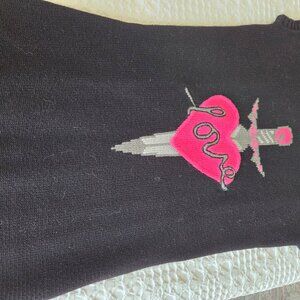 Betsey Johnson Bodycon Black sweater dress with pink and grey trim around bottom of dress. Heart and daggar design on front of dress. Scoop neckline.