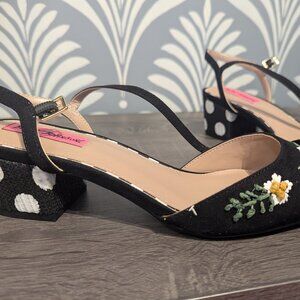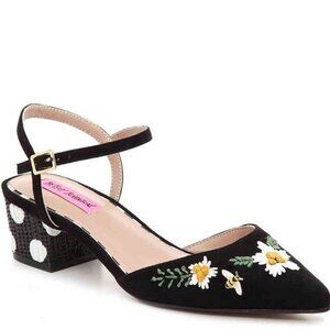 Betsey Johnson Daisy Embroidered Bee Black Vegan Suede Polka Dot Heels