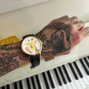 Charming Betsey Johnson watch with a playful giraffe design. Gold-tone case with a black leather strap. Perfect for adding a whimsical touch to any outfit.