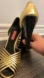 Gold leather shoes, with crystal rose on the heel. 4.5” Heel Only worn a few times but missing some gems, some scuffs.