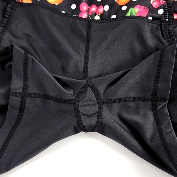 Stylish black shorts with a vibrant fruit and polka dot waistband, perfect for adding a pop of color to your activewear collection.