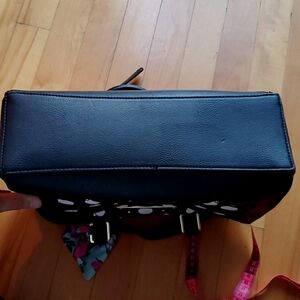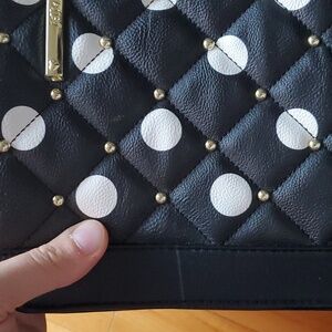 Betsey Johnson Polka dot crossbody bag. Floral scarf. Adjustable strap; can be removed to make a handbag. Gold details. Small scratch and stain at the front as seen on pictures. Back of the purse has stain because of friction of clothes when wearing the bag as a crossbody bag (see pictures). See pictures for measurements. Floral print inside the purse, no stain or hole inside.