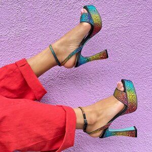 Stunning Betsey Johnson Rainbow Glitter Rhinestone Dress Heels with Platform Pumps heels. multi coloured.