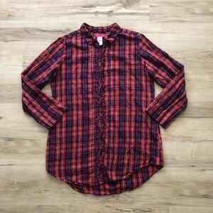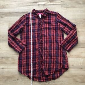 Stylish plaid pajama top. Features button-down front. Comfortable and chic design.