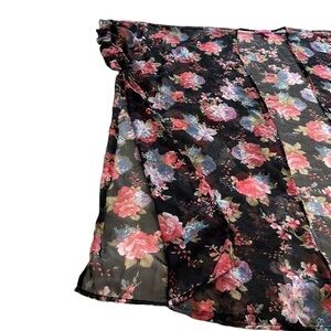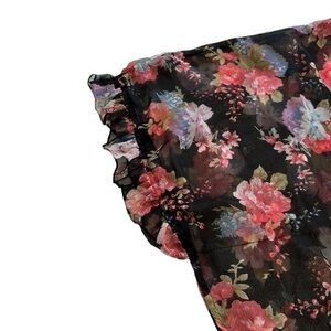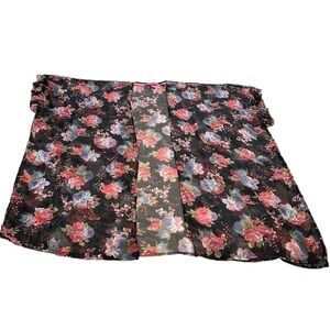 Betsey Johnson black floral duster. Gorgeous colours with a feminine ruffle on the sleeve. Perfect addition to your wardrobe, very versatile! It can be used as a bathing suit cover up, or to layer over jeans and a top, or even leggings and a tank.