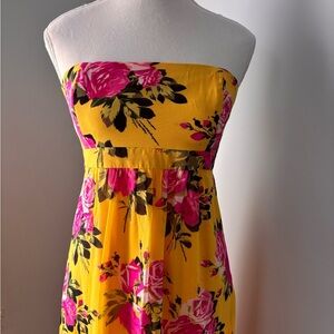 Vibrant yellow dress with bold pink floral design. Strapless style for a chic look. Perfect for summer events. Excellent condition. Side zipper.