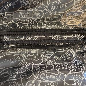 Signature black and white graffiti lining with 2 interior zipper compartments with clear windows.