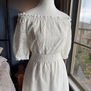 White eyelet off shoulder midi dress from Betsey Johnson, size XS and new with tags. Gorgeous material, dress is 100% cotton with 100% polyester lining. Wide elastic waist, puff short sleeves. Bust measures 14.5 inches, waist 10.5 inches (can go easily to 14 due to elastic), hips 21 inches, length from shoulder to hem is 43 inches. Cat friendly, nonsmoking home.