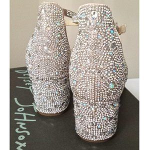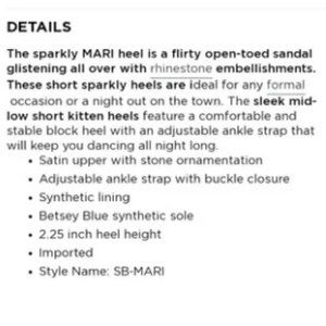 New in box/never worn Betsey Johnson "Mari" open-toe sandals in manufacturer's colour Champagne. Satin uppers with beautiful all over sparkling rhinestone embellishments, adjustable ankle straps, padded footbeds and 2.25" block heels. Size 5.5 Wide These are gorgeous shoes and would be perfect for Grad, Wedding, or any special occasion. At time of listing these shoes are currently selling on Betsey Johnson site for $109 USD = $146 CAD approximately. **Please note there is damage to the box only. Received new from store this way**