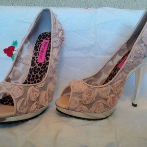 Betsey Johnson - blush pink roses peep toe and silver chrome platform and heels
