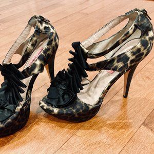 Gorgeous evening high heels cheetah print ornate with black ribbon. Textile upper. Man made material.