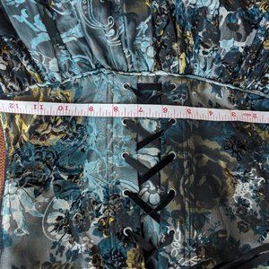 Worn for grad, and to try on a couple times. One hook in the corset needs to be re-sown. Some staining on the lace at the armpits. In great condition other than that.