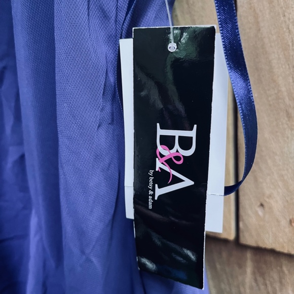 Romantic ruffles cascade across this floor-length spaghetti-strap gown from Betsy & Adam.