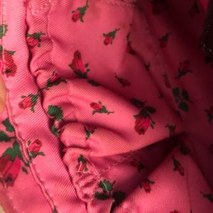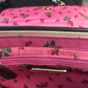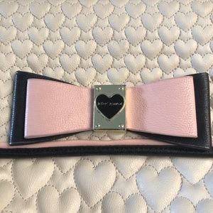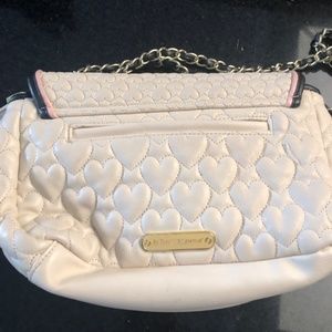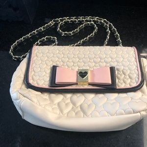 Cute Betsy Johnson bag with pink and black bow detail and cushion hearts. Bright pink pattern interior. Very clean condition. Pastel with cushion patten crossbody. 14”x9”
