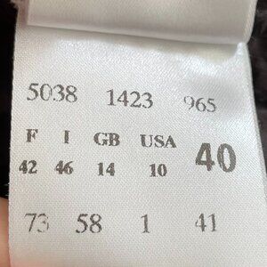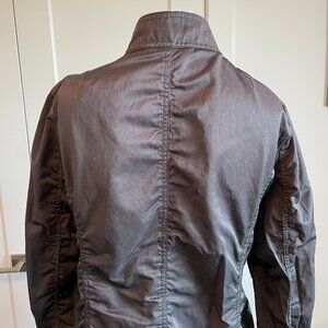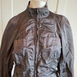 Features: full zip closure, unique ruching detail on primary seams, fabric has a subtle sheen, 4 patch pockets, 2" high collar, 5.5" zipper detail on cuffs, styled in Germany, neutral, high quality garment
