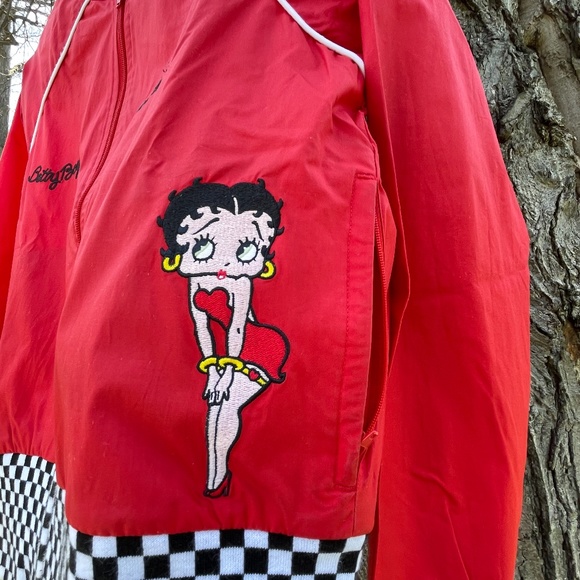 Adidas x Betty Boop collab light track jacket. Has a peek-a-boo Betty in the back, 2 zippered pockets, and zipper + 2 button close at the neck. Thrifted but in amazing condition! Good as new :)