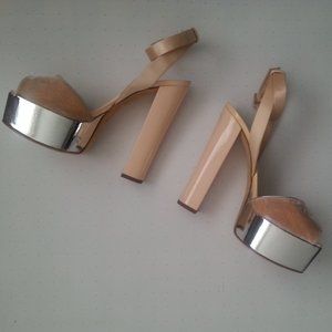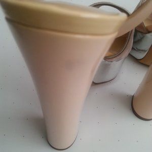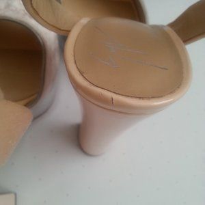 Pearl and nude leather Amelia velvet sandals from Giuseppe Zanotti Design featuring a platform sole, an ankle strap with a side buckle fastening, a high block heel, a leather sole, a brand embossed insole, a peep toe, a low vamp, crushed velvet front upper, a clog style design, satin ankle strap, mirrored patent platform and 140 mm (5.5 inch) heel with 40 mm (1.6 inch) platform. Silk 100% Leather 100% Leather 100% Cotton 100% Patent Leather 100%
