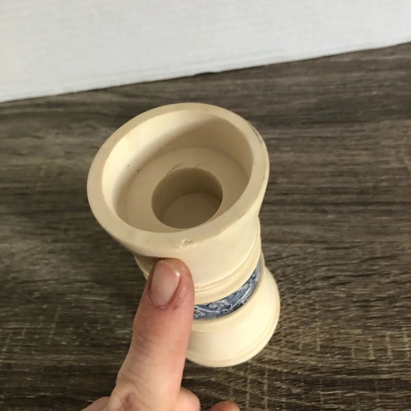 Betty Singer is the designer behind Sarah’s angels. Lovely cream coloured resin candle stick holder with blue renaissance style accent band.