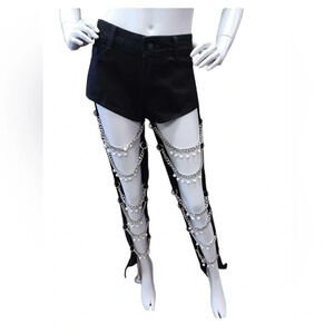 Black jeans with chrome toned chains and pearls. Featuring a five pocket design with belt loops and a standard button and zipper closure.