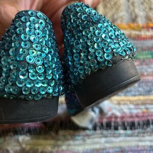 Elegant flats with intricate blue and green beadwork. Perfect for a stylish look. Some sequins are missing. Some scraping on beads. Missing sequins. See pics.