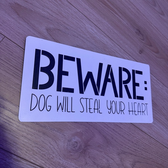 White sign with bold black text: 'BEWARE: DOG WILL STEAL YOUR HEART'.