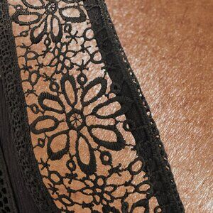 There are many ways to wear this, whether with more black or accents in pink, teal or bronze silk underneath to showcase the lace. It can also be worn like a jacket if a simply slip dress is worn under it.