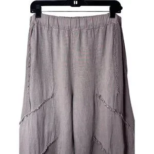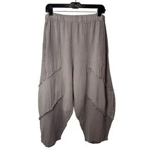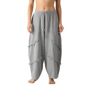 The Beyond Capri voluminous "bubble" pants feature a harem-style design with a highly exaggerated, loose, and "slouchy" fit. The dropped crotch and voluminous shape taper slightly towards the cropped ankle hem. They have an elasticated, pull-on waistband for comfort and a flexible fit, often designed in "one size" to accommodate various body types. The pants are characterized by distinctive diagonal seams running across the front of the legs, with frayed detailing for added texture.