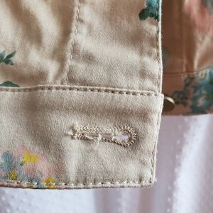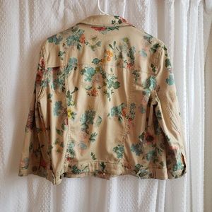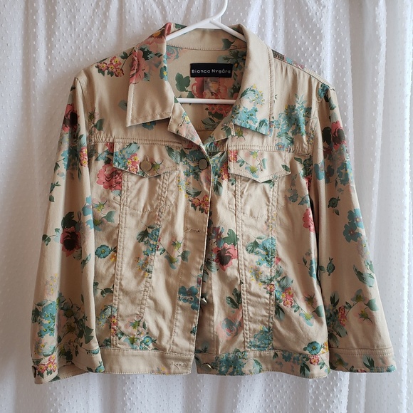 Bianca Nygard Button Jacket with multicoloured floral print on a beige/khaki base. Sleeves also have buttons. Women's Size 10.