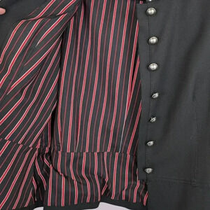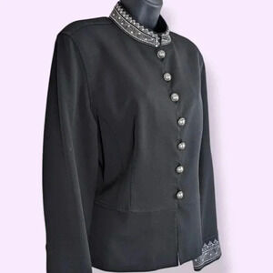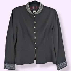 This black jacket by Bianca Nygard Petite is made of a polyester/viscose/spandex blend (63/32/5) and is well tailored. It has silvery metallic embroidered detailing around the cuffs and the neck, silver tone metal front buttons, buttoned cuffs, padded shoulders, and a full red striped lining. It is a petite size and so is a little shorter than a non-petite piece.