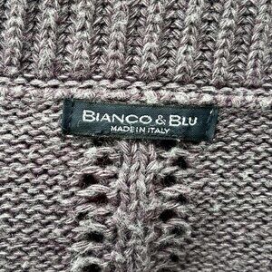 Bianco & Blu is known for Italian-made knitwear that balances sculptural design with refined materials and polished finishing. This wrap-style cardigan is executed in a richly textured wool knit, featuring dimensional cable and openwork panels that add depth without heaviness. A substantial ribbed shawl collar frames the neckline, while the front closes discreetly with two hidden snaps and finishes with a satin waist tie for definition and structure. Chosen for its architectural knitwork, tailoring, and boutique-level Italian craftsmanship, it wears more like a lightweight jacket than a casual sweater.