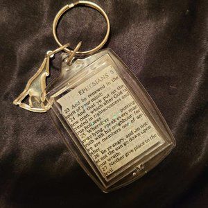 Hand crafted keychain with KJV scripture and a metal wolf howling pendant for decoration, there are subtle sparkles on both sides. The video included is only an example to show the subtle sparkles and is not the same scripture included in this listing. This listings scripture includes: "and be renewed in the spirit of your mind; and that ye put on the new man, which after God is created in righteousness and true holiness."
