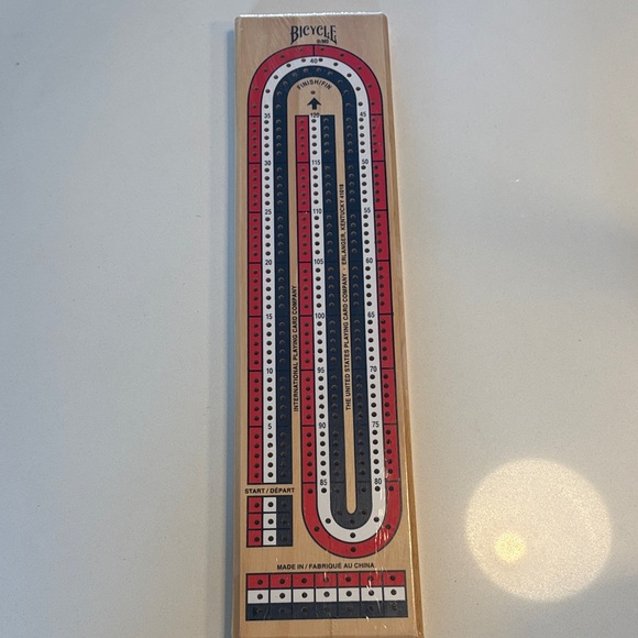 Classic Bicycle wooden cribbage board with red, black, and white tracks. Perfect for game nights. New in package.