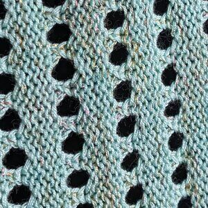 This poncho-style sweater by Big Buddha is made of a rayon/acrylic/"other" blend (48/45/7). The sweater is quite rectangular and has a round neckline. The bottom hem is fairly flat across and there is a small button on each end holding the back and front together under the arm (see pic 7). The fabric is a nice, lightweight open knit with multicolour metallic threads woven throughout (see pic 6). The sweater is in good condition overall.