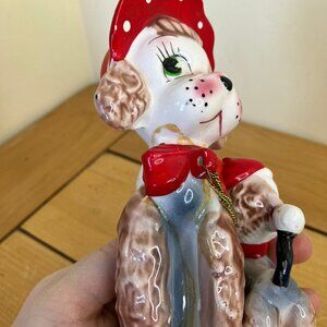 Vintage ceramic figurines of a seated Poodle with a standing puppy figurine, attached by a gold chain. Largest figure is 6 1/2" tall x 2 1/2" wide. Puppy figure is approx. 3 1/2" tall x 2" long. Largest figure is stamped "Japan" on the bottom. Repaired condition: Larger figurine was broken and glued back together - glue residue is visible along the back and neck. Only has one of the puppy figurines - the second is missing (chain is still attached). See photos.