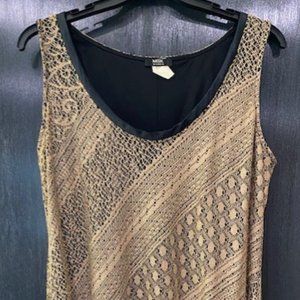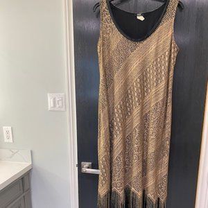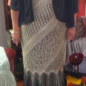 Worn once! Floor length lined gold crochet gown with gold fringe over black bottom. Sexy, form fitting, yet very slimming. Sleeveless, tank type top. Bolero not included. 5"9" with heels. Bottom can be shortened.