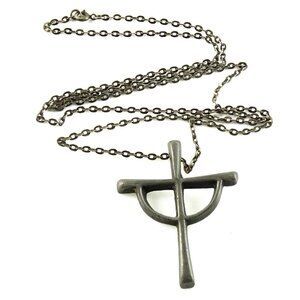 Big chunky stylized pewter cross pendant on long chain necklace.